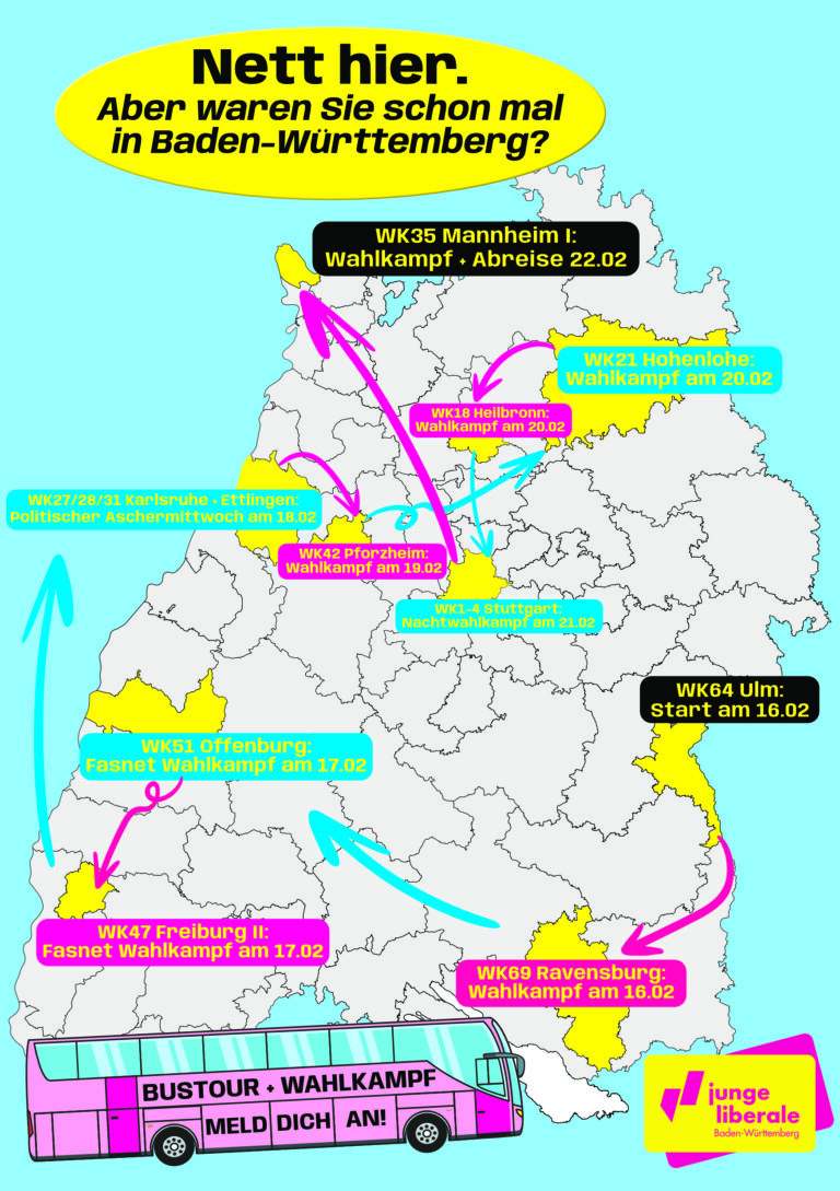 wir freuen uns, euch ein einmaliges GOTV (Get Out The Vote)-Event anbieten zu können. Vom 16.02.2026 bis zum 22.02.2026 habt ihr die Möglichkeit, mit dem Bus durch Baden-Württemberg zu fahren, Wahlkampf zu machen und zu feiern.